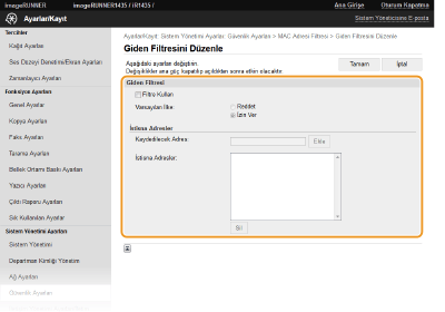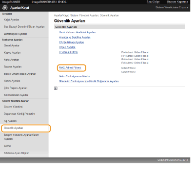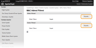 Giriş hatalarını kontrol edin MAC adresleri yanlış şekilde girildiyse, Uzak Kullanıcı Arabirimi'nden makineye erişemeyebilirsiniz ve bu durumda <MAC Adresi Filtresi> seçeneğini <Kapalı> olarak ayarlamanız gerekir. MAC Adresi Filtresi