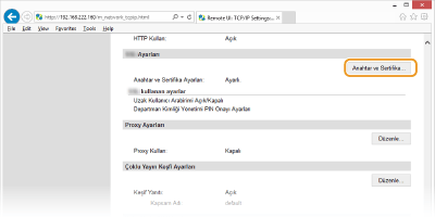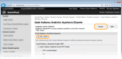 tuşuna basarak etkinleştirebilir veya devre dışı bırakabilirsiniz. TLS KullanUzak Kullanıcı Arabirimi'ni TLS ile BaşlatmaTLS etkin haldeyken Uzak Kullanıcı Arabirimi'ni başlatmaya çalışırsanız, güvenlik sertifikasıyla ilgili bir güvenlik uyarısı görüntülenebilir. Bu durumda, adres alanına doğru URL'nin girilip girilmediğini kontrol edin ve ardından Uzak Kullanıcı Arabirimi ekranını görüntülemek için ilerleyin. Uzak Kullanıcı Arabirimini Başlatma