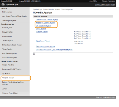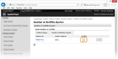 [Anahtar ve Sertifika Ayarları] (anahtar çiftleri için) veya [CA Sertifikası Ayarları] (CA sertifikaları için) seçeneğine tıklayın.
