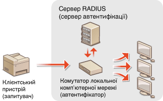 Апарат може підключитися до мережі 802.1X як клієнтський пристрій. Типова мережа 802.1X складається із сервера RADIUS (сервер автентифікації), перемикача локальної мережі (автентифікатора) та клієнтських пристроїв із програмним забезпеченням автентифікації (запитувачі). Якщо пристрій намагається підключитися до мережі 802.1X, пристрій має пройти автентифікацію користувача, щоб довести, що підключення створено авторизованим користувачем. Інформація про автентифікацію надсилається до сервера RADIUS, який її перевіряє та дозволяє зв’язок із мережею або відхиляє його залежно від результату автентифікації. Якщо автентифікація не вдається, перемикач безпроводової локальної мережі блокує доступ зовні мережі.