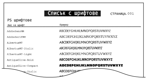 Можете да отпечатате списък за проверка на шрифтовете, достъпни в PS режим.