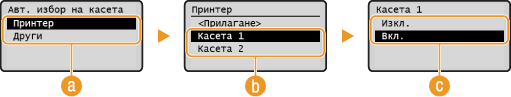 Активирайте или деактивирайте автоматичния избор на касета като източник на хартия. Ако за автоматичен избор на касета за хартия е зададена настройка <Вкл.>, машината автоматично избира заредена хартия с подходящ формат. Също така, когато хартията свърши, тази настройка позволява отпечатването да продължи чрез превключване от един източник на хартия към друг, който е зареден с хартия със същия формат.