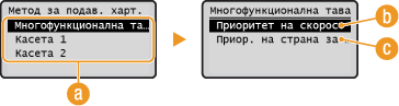 Хартия), за източника на хартия се използва настройка <Приоритет на скорост>. В този случай е необходимо да заредите хартията по същия начин, както когато сте избрали <Приоритет на скорост> (