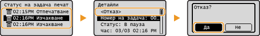 Отмяна чрез отдалечен ПИМожете да отмените отпечатването от страницата [Job Status] на отдалечения ПИ: Проверка на текущия статус на документи за печат