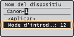 per canviar el tipus de text introduït. El tipus de text seleccionat actualment s'indica com a <Mode d'introducció: A>. Podeu triar entre els tres tipus de text següents: <A> (majúscules) , <a> (minúscules), o <12> (numèric).
