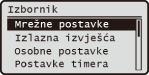 , prikazat će se zaslon <Izbornik>. Na tom zaslonu možete započeti određivanje općenitih postavki uređaja, kao što su <Uobičajene postavke> ili <Postavke timera>, te brojnih postavki za ispisivanje.