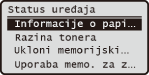 Prikazuje status uređaja, kao što je količina preostalog papira ili tonera.