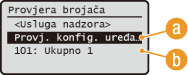 (Provjera brojača), prikazat će se izbornik <Provjera brojača>. Na ovom izborniku možete vidjeti stanja brojača kao i serijski broj i konfiguraciju uređaja.