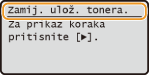 Prikazana poruka ovisi o količini preostalog tonera. Ovisno o tome kakva se poruka prikazuje, morate pripremiti zamjenski spremnik tonera ili ga zamijeniti.