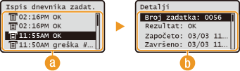 .![]() <Ispis dnevnika zadat.>Prikazuje popis ispisanih dokumenata. <U redu> se prikazuje ako je dokument uspješno ispisan, a <Pogreška> se prikazuje ako dokument nije ispisan zbog otkazivanja ili zbog neke pogreške.