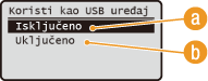 Možete deaktivirati USB port za računalnu vezu. Ako je priključak onemogućen, uređaj ne može komunicirati s računalom putem USB veze. Ova postavka neće utjecati na druge USB portove