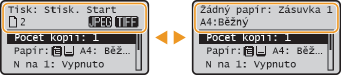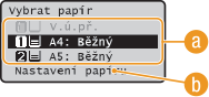 (Výběr/Nastavení papíru) vyberte papír, který chcete použít, na obrazovce <Vybrat papír>. Pomocí tohoto tlačítka můžete také změnit nastavení papíru, pokud do zařízení ukládáte papír jiné velikosti nebo typu, než byla velikost nebo typ předchozího papíru. Upozorňujeme, že nastavení papíru musí být zadáno správně, aby byl papír podáván bez problémů.