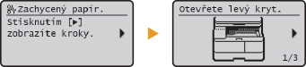 V některých případech se po výskytu chyby zobrazí postup, jak na chybu reagovat. Podle pokynů na obrazovce problém vyřešte. Jako příklad je níže uvedena obrazovka, která se objeví, když dojde k zachycení papíru (