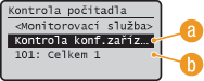 (Kontrola počítadla) se zobrazí obrazovka <Kontrola počitadla>. Prostřednictvím této obrazovky můžete zobrazit hodnotu počitadla, sériové číslo zařízení a konfiguraci zařízení.