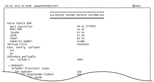 Seznam nabídky nastavení) a aktuální nastavení uložená v zařízení, např. velikost a typ papíru. Zkontrolovat můžete také informace o nastavení pro <Nastavení sítě> a <Nastavení správy systému>, které nejsou obsaženy v seznamu uživatelských dat (