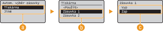 Výběrem volby <Zapnuto> aktivujete automatický výběr zásuvek pro zdroj papíru, který jste vybrali na předchozí obrazovce (