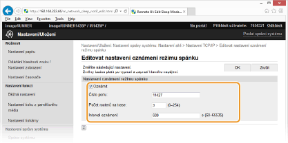Políčko zaškrtněte, chcete-li software pro správu zařízení upozorňovat na stav napájení zařízení. Když je zaškrtnuto políčko [Oznámit], můžete očekávat, že nebude docházet k nepotřebné komunikaci zařízení během režimu spánku a sníží se celková spotřeba energie. [Číslo portu:]