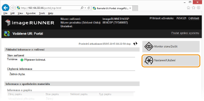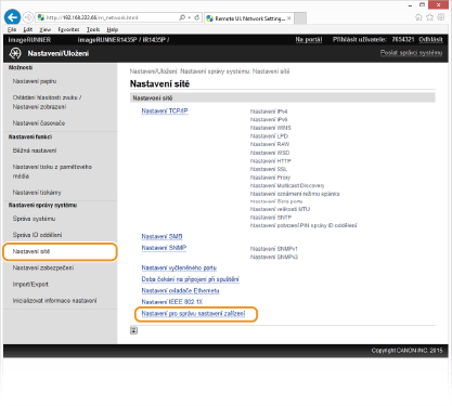 Shromažďování a správu různých informací o síťových zařízeních můžete zjednodušit tak, že do sítě implementujete software pro správu zařízení, například iW Management Console*. Informace, jako jsou nastavení zařízení a chybové protokoly, se získávají a distribuují prostřednictvím serverového počítače. Je-li zařízení zapojeno do takové sítě, software pro správu zařízení vyhledá zařízeni v síti pomocí protokolů, jako je SLP (Service Location Protocol), s cílem získat od zařízení informace. V této části jsou popsány postupy nastavení protokolu SLP a nastavení pro komunikaci mezi zařízením a pluginy pro nástroj iW Management Console. Tato nastavení lze provést pomocí vzdáleného uživatelského rozhraní.