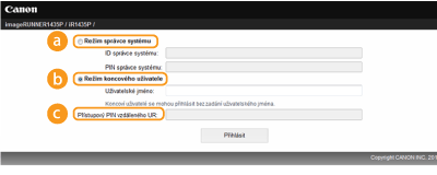 Můžete provádět všechny operace vzdáleného uživatelského rozhraní a zadávat všechna nastavení. Zadejte příslušné ID do pole [ID správce systému:] a PIN do pole [PIN správce systému:] (