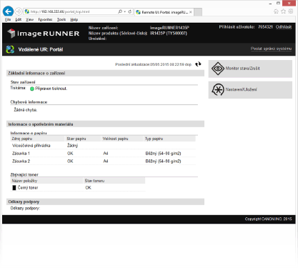 Chcete-li zařízení vzdáleně ovládat, je třeba do webového prohlížeče zadat IP adresu zařízení a spustit vzdálené uživatelské rozhraní. IP adresu nastavenou pro zařízení si předem zkontrolujte (