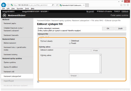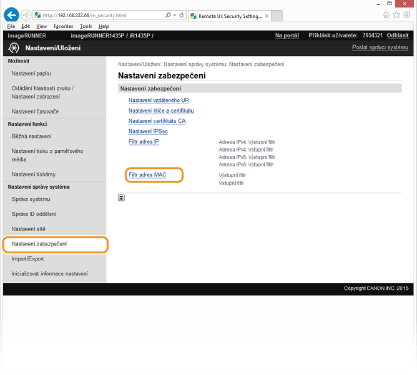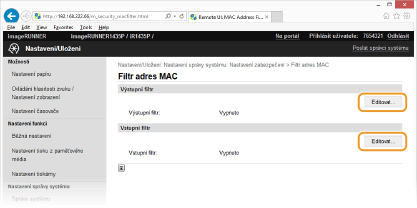 Zkontrolujte správnost zadaných adres Zadáte-li MAC adresy nesprávně, nebude možné se k zařízení připojit prostřednictvím vzdáleného uživatelského rozhraní. V takovém případě je třeba nastavit <Filtr adres MAC> na <Vypnuto>. Filtr adres MAC