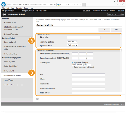 Zadejte nastavení pro klíč a certifikát.
