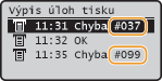 Na obrazovce <Monitor stavu> se objeví trojmístné číslo (chybový kód), jestliže dojde k chybě, např. když se nezdaří tisk nebo se zaplní paměť. Níže jsou uvedeny podrobné informace týkající se příčin a řešení pro jednotlivé chybové kódy.