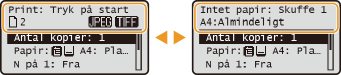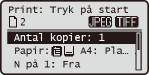 (Papirvalg/Indstillinger) for at vælge det papir, du vil anvende på skærmen <Vælg papir>. Du kan f.eks. også trykke på denne tast for at ændre papirindstillingerne, når du ilægger et andet papirformat eller en anden papirtype end det, der var ilagt tidligere. Bemærk, at papirindstillingen skal være angivet korrekt, så papiret fremføres rigtigt.