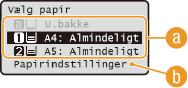 Brug den til at angive det papirformat og den papirtype, der er lagt i papirskuffen. Du kan også registrere indstillingerne for det papir, du ofte lægger i universalbakken.