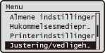 Alle indstillinger om justering og vedligeholdelse vises med korte beskrivelser. Standardindstillingerne er angivet med en daggert (