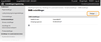 SMB (Server Message Block) er en protokol til deling af ressourcer, f.eks. filer og printere, hvor der er flere end én enhed på et netværk. Maskinen bruger SMB til at registrere en WINS-server (Windows Internet Naming Service) til hentning af IP-adressen fra serveren. Afhængigt af dit netværk kan det være nødvendigt at angive NetBIOS-navn og arbejdsgruppenavn. Konfiguration af WINS
