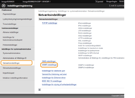 Når SNMP-styringssoftwaren er installeret på en computer på netværket, kan du konfigurere, overvåge og styre maskinen fra fjernlokation via computeren. Du kan få flere oplysninger i betjeningsvejledningen til din styringssoftware.