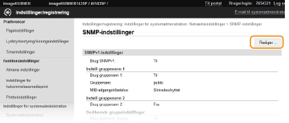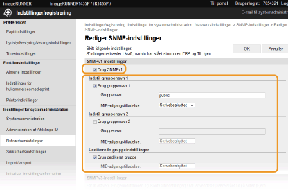 Hvis begge SNMP-versioner er aktiveret, anbefales det, at MIB-adgangstilladelse i SNMPv1 angives til [Skrivebeskyttet]. MIB-adgangstilladelsen kan indstilles uafhængigt i SNMPv1 og SNMPv3 (og for hver bruger i SNMPv3). Hvis [Læs/skriv] (fuld adgangstilladelse) vælges i SNMPv1, negerer det de robuste sikkerhedsfunktioner, der er et kendetegn ved SNMPv3, fordi de fleste af maskinindstillingerne så kan kontrolleres med SNMPv1.
