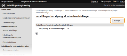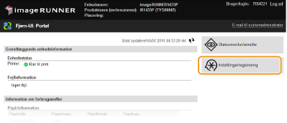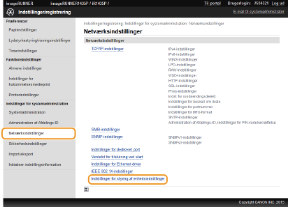 Du kan lette indsamling og administration af forskellige oplysninger om netværkstilsluttede enheder ved at implementere software til styring af enheder, f.eks. iW Management Console*, på netværket. Oplysninger, som f.eks. enhedsindstillinger og fejllogge, hentes og distribueres via servercomputeren. Hvis maskinen er tilsluttet et sådant netværk, søger softwaren til enhedshåndtering efter maskinen på netværket ved hjælp af protokoller, som f.eks. SLP (Service Location Protocol), for at indsamle oplysninger fra maskinen. Dette afsnit beskriver procedurerne vedrørende SLP-indstillinger og indstillinger for kommunikation mellem maskinen og plug-ins til iW Management Console. Disse indstillinger kan angives via Remote UI.