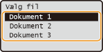 Hvis de sikrede dokumenter fra to eller flere brugere holdes i hukommelsen, vises skærmen <Vælg bruger> før skærmen <Vælg fil>. Brug