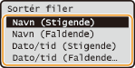 Når du vælger <Dato/tid (Stigende)> eller <Dato/tid (Faldende)>, sorteres filerne ud fra datoer og tidspunkter for ændring af filerne.