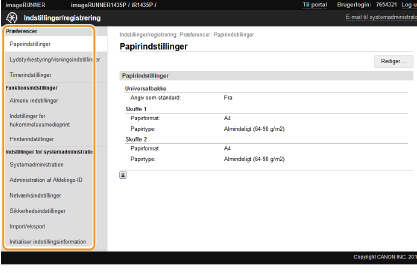 Du kan kun ændre indstillingerne under [Indstillinger for systemadministration], når du er logget på i systemadministratorstatus.