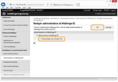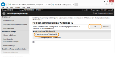 Marker afkrydsningsfeltet [Administration af Afdelings-ID], og klik på [OK].