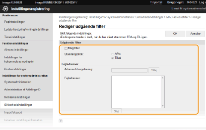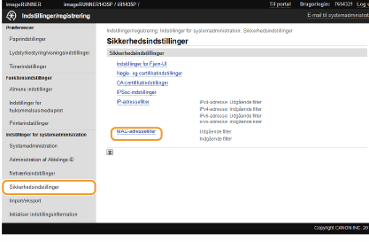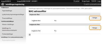 Kontroller tastefejl Hvis MAC-adresserne er indtastet forkert, kan du muligvis ikke få adgang til maskinen fra Brugerinterface til fjernbetjening. I dette tilfælde skal du angive <MAC-adressefilter> til <Fra>. MAC-adressefilter