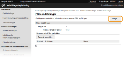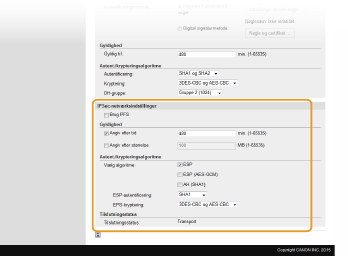 Hvis du vil aktivere ESP-godkendelsen, skal du vælge [SHA1] for hashalgoritmen. Vælg [Brug ikke], hvis du vil deaktivere ESP-godkendelsen.