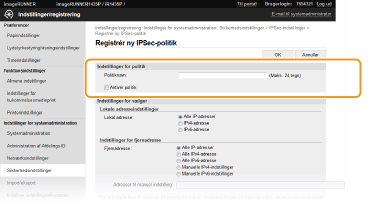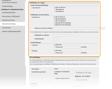 Vælg indstillingen for at angive en enkelt IPv4-adresse eller et udvalg af IPv4-adresser for at anvende IPSec. Angiv IPv4-adressen (eller området) i tekstfeltet [Adresser til manuel indstilling:].