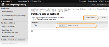 Nøglepar og digitale certifikater kan hentes fra en CA (certification authority) til brug på maskinen. Du kan gemme og derefter registrere disse filer ved hjælp af Brugerinterface til fjernbetjening. Sørg for, at nøgleparret og certifikatet over maskinens krav (