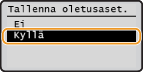 Kun oletuspaperiasetus on tallennettu, paperiasetusnäyttöä ei näytetä, kun paperia lisätään, ja samaa asetusta käytetään aina. Jos lisäät erilaista paperikokoa tai -tyyppiä vaihtamatta paperiasetuksia, laite ei ehkä tulosta oikein. Voit välttää tämän ongelman poistamalla oletusasetuksen käytöstä valitsemalla <Ei> vaiheessa 3 ja lisäämällä sitten paperin.