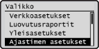 Aseta <Aikavyöhyke> ennen päivämäärän ja ajan asettamista. Jos <Aikavyöhyke>-asetusta muutetaan, nykyinen päivämäärä ja aika muuttuvat vastaavasti.