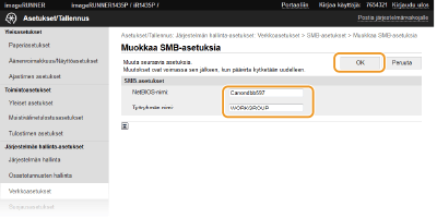 SMB (Server Message Block) on protokolla, jolla jaetaan resursseja, kuten tiedostoja ja tulostimia, useamman kuin yhden verkossa olevan laitteen kanssa. Laite käyttää SMB:tä tallentamaan WINS (Windows Internet Naming Service) -palvelimen IP-osoitteen saamiseksi palvelimelta. Verkosta riippuen voit joutua asettamaan NetBIOS-nimen ja työryhmän nimen. WINS-palvelun määrittäminen