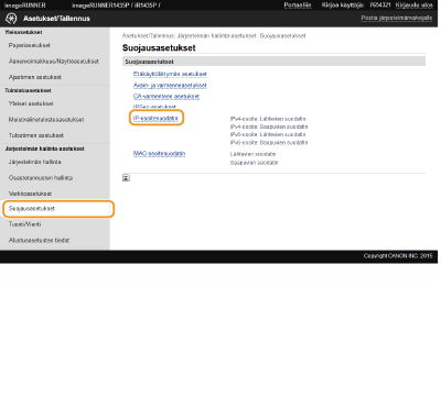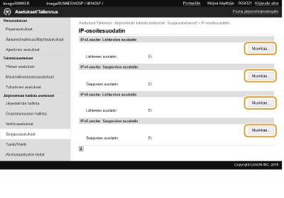 Tarkista, ettei syötössä ole tapahtunut virheitä Jos IP-osoitteet on syötetty väärin, et ehkä pysty käyttämään laitetta Etäkäyttöliittymästä, missä tapauksessa sinun on asetettava <IPv4-osoitesuodatin>- tai <IPv6-osoitesuodatin>-asetukseksi <Ei>. IPv4-osoitesuodatin IPv6-osoitesuodatin