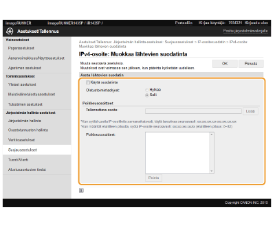 Voit ottaa IP-osoitteen suodatusasetukset käyttöön tai poistaa ne käytöstä