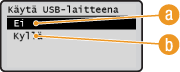 Voit poistaa käytöstä tietojen tulostamisen USB-muistilaitteesta. USB-muistilaitteessa olevia tietoja ei voi tulostaa.
