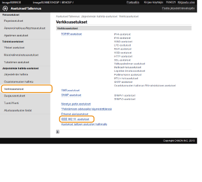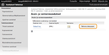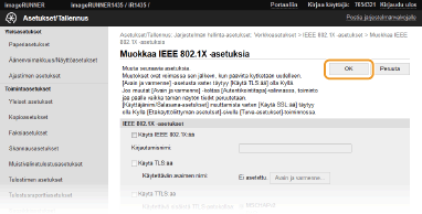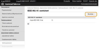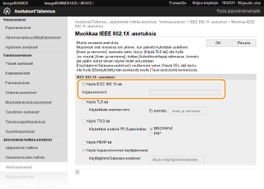 Voit ottaa IEEE 802.1X-todennuksen käyttöön tai poistaa sen käytöstä  -painikkeella. IEEE 802.1X -asetukset