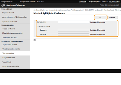 [Muuta salasana] Aseta tai muuta salasana valitsemalla tämä valintaruutu ja syöttämällä enintään 24 aakkosnumeerista merkkiä pitkä uusi salasana kenttiin [Salasana:] ja [Vahvista:].